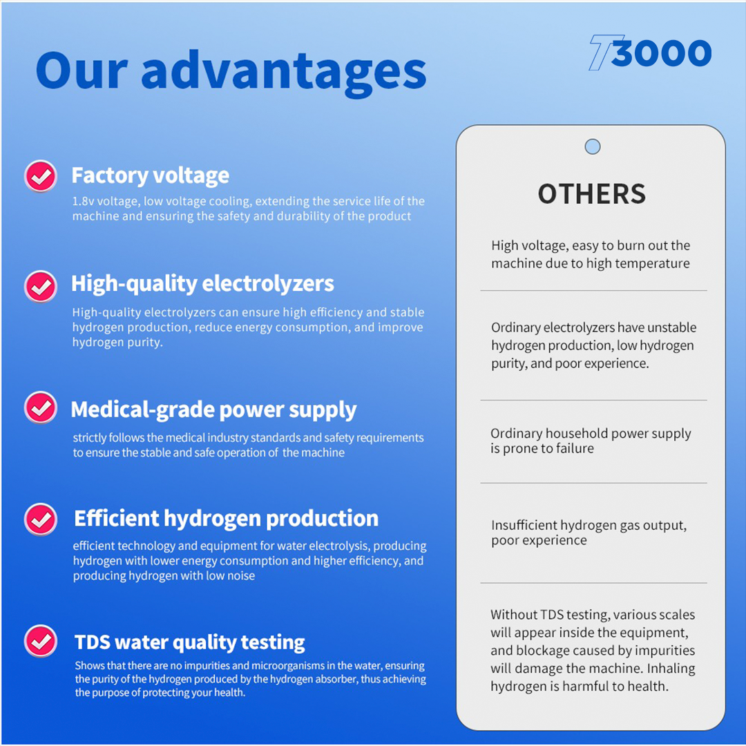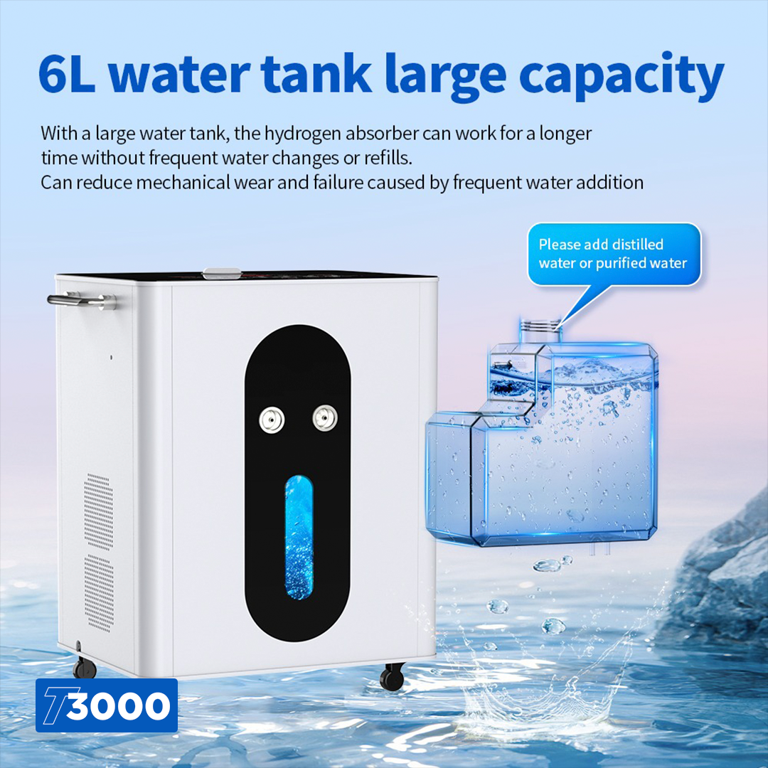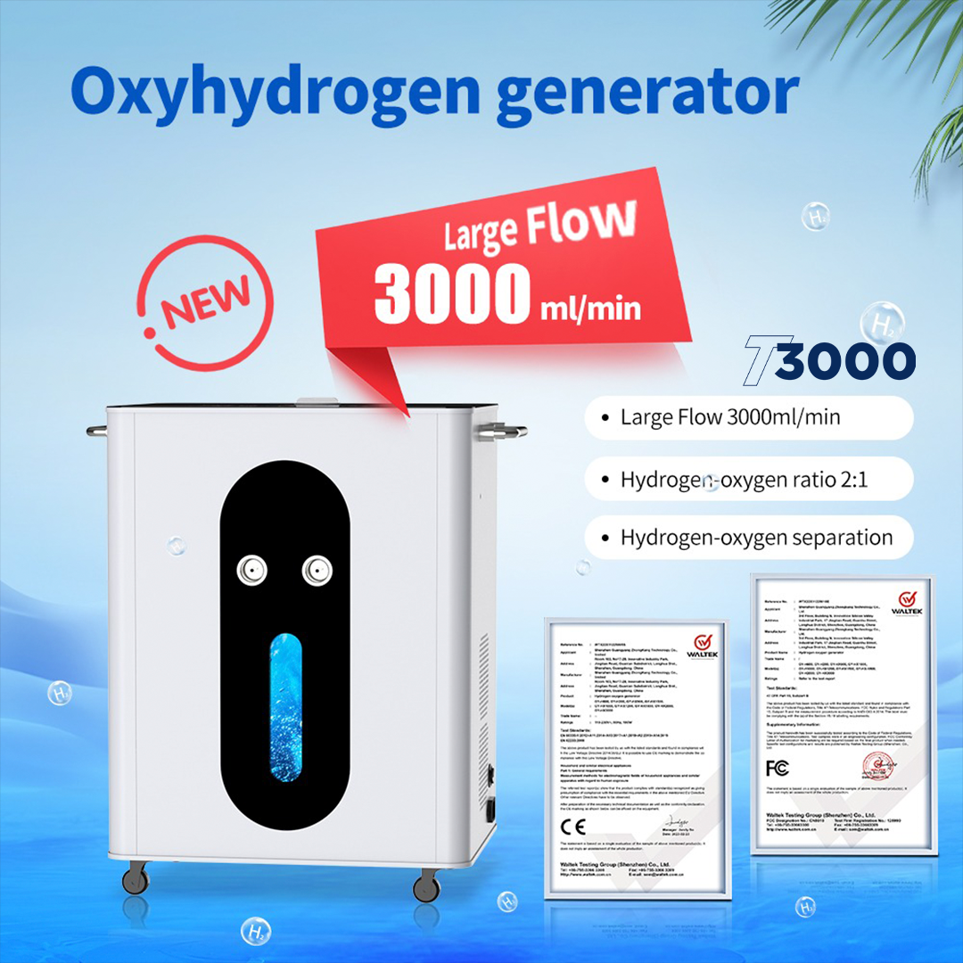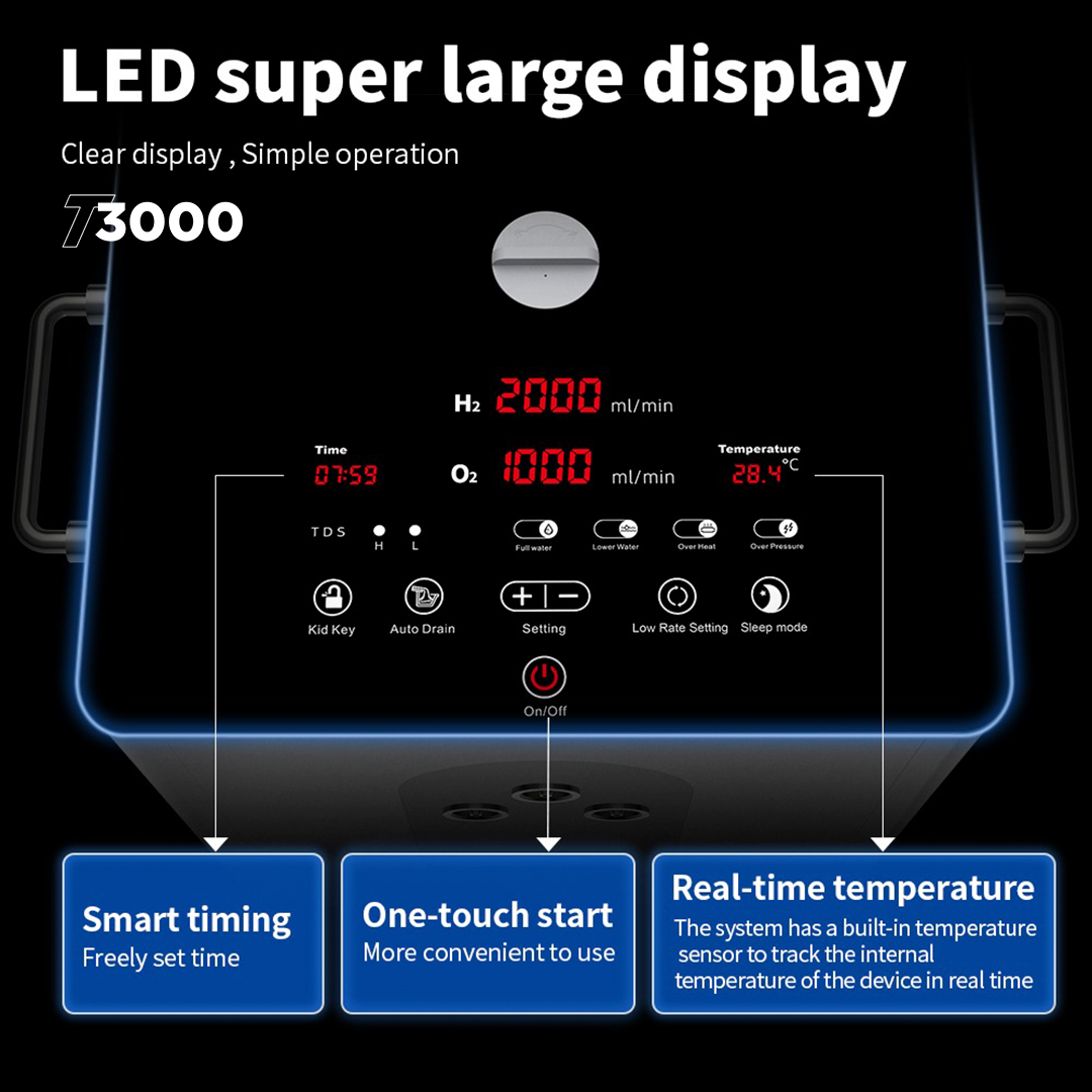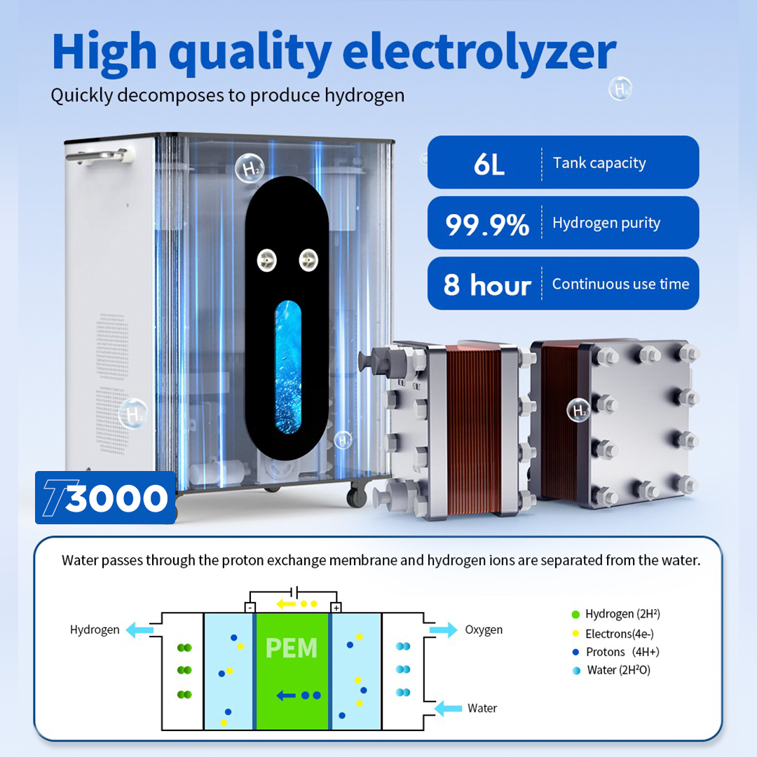 • Design de alto rendimento: fornece 3.000 ml de água rica em hidrogênio por minuto, com saídas duplas de hidrogênio e uma saída dedicada de oxigênio para máxima versatilidade e desempenho.